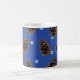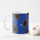 Ein Naturdesign mit Kiefernfüßen und Mini-Schneeflocken auf blauem Hintergrund.