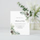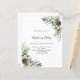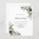 Weißer Hintergrund, mit Kieferntönen verziert, weiße Beeren, grüne Blätter. Personalisieren Sie Ihre Party-Daten und fügen Sie sie hinzu. Schwarze Buchstaben. 1 Blatt = 1 Einladung mit Druckkante bis Kante.