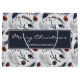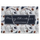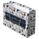 Große Geschenktasche mit einem schönen Muster. Kiefernzapfen, Federn, Kiefernnadeln und Beerensprigs. Rustikales Aquarelldesign. Frohe Weihnachten und ein personalisierter Name in einem dunkelblauen Rahmen in der Mitte geschrieben.