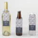 Flaschenanhänger mit einem schönen Muster. Kiefernzapfen, Federn, Kiefernnadeln und Beerensprigs. Rustikales Aquarelldesign.