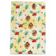 Weihnachtsgeschenktasche mit niedlichem Muster mit Kiefernfüßen und heilig auf einem gelben Aquarellhintergrund mit kleinen weißen Kreise verstreut.