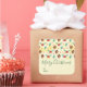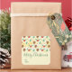 Fröhliche Weihnachtsaufkleber mit niedlichem Muster mit Kiefernfüßen und heilig auf einem gelben Aquarellhintergrund mit kleinen weißen Kreise verstreut.
