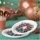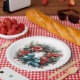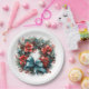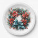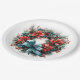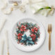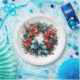Papier Teller mit einem hübschen Weihnachtskranz. Ein festliches Bild mit einem Kiefernkranz mit roten Blume, Heiligenschein und einem schönen blauen Bogen. Schön.