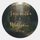 Elegante Natur inspiriert Pinienwald Grün und Gold Drehbuch Hochzeitsaufkleber. Personalisieren Sie diese, indem Sie Ihren eigenen Namen und Ihre eigenen Details hinzufügen, um es zu Ihrem eigenen zu machen. Ideal für Geschenketiketten, stationäre Umschlag Aufkleber, Mailing und vieles mehr.