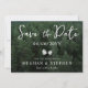 Eine rustikale Save the Date-Karte mit einem landschaftlichen Foto im grünen Wald von Destei und elegantem Schriftzeichen, das "Save the Date" liest. Das Datum wird deutlich über zwei zarte pinecone Silhouetten angezeigt, die eine charmante waldländische Touch hinzufügen. Im Folgenden lädt eine klassische Linie die Gäste zur Hochzeit des Paares ein, mit Platz für Namen und einem Hinweis, dass eine formelle Einladung folgen wird. Die Rückseite der Karte zeigt einen grünen Hintergrund mit passenden pinecone Silhouetten, die einen personalisierbaren Bereich für die Initialen und das Hochzeitstag des Paares bilden. Ideal für naturliebende Paare, die eine Hochzeit im rustikalen, Outdoor-, Wander- oder Waldbereich planen.