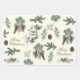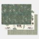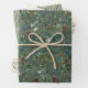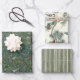 Ein Set für Naturliebhaber. Das erste Packpapier ist eine Collage aus dichten, immergrünen Zweigen, die Kiefer-, Fichten-, Eibe-, Tannen- und Wachsennadeln umfasst. Auf der zweiten Zeitung sind der französische Ausdruck "Joyeux Weihnachten" und "Frohe Weihnachten" mit immergrünen Ästen und Pinecones vermischt, wobei ein auf einem verschneiten Zweig aufsitzender Junge einen Spitznamen hat. Schließlich hat das dritte Papier Vintage grüne Streifen.