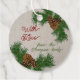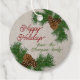 Klassischer "Happy Holidays" Grußwunsch an rustikalen grünen Pineconadeln Zweige Kränze Motiv auf einem Imitat taupe beige braune Gewebe Gewebe Muster Hintergrund. Mit der Möglichkeit, Ihren Familiennamen und (begrenzten) Text Ihrer Wahl anzupassen oder zu personalisieren.
