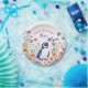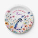 Ein niedlicher Pinguin umgeben von rosa, blau, orange und lila Blumen Aquarellmalerei Mädchen Geburtstagsparty personalisierten Papier Teller.