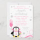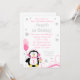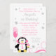 Eine niedliche und mädchenhafte Winterparty auf der Bundebene. Mit einem süßen Pinguin, Kuchen, Wirbel und Schneeflocken. In Rosa- und Grautönen dargestellt. Einfach für Ihr Party personalisieren!