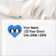 Niedlicher Cartoon Pinguin Paar mit blauem Herzhintergrund.