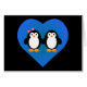 Niedlicher Cartoon Pinguin Paar mit blauem Herzhintergrund.