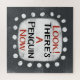 Ein unwiderruflich seltsames typografisches Tierdesign, das "Schau! Es gibt jetzt einen Pinguin." Es ist mit schwarzem und rotem Text auf einem weißen Rechteck mit funky, spielerisch weißen Punkten umgeben, die alle auf einem grauen Hintergrund liegen.