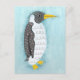 Ein Niedlicher Pinguin mit keuschigen und rosafarbenen Punkten schaut auf einem blauen, eisigen Hintergrund.