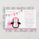 Eine niedliche Wintermärchenland-Geburtstags-Party Einladung. Aufmachung eines Pinguins, der Schneeflocken, Geburtstagskuchen und Mit dem Kopfe stoßen der Fahne. Macht ein großes, für ein Mädchen-Geburtstags-Party des Winters einzuladen themed. Gezeigt im Rosa und im Grau.