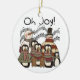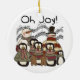 Zwei Schneemänner und fünf Pinguine singen Feiertagsliede und Text liest "oh Freude!" auf Andenkenfeiertagsverzierungen.
