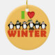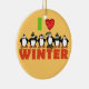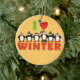 Eine Gruppe von Pinguinen, die im Winter gekleidet sind, trägt Hut und Schals und Text, der auf den Feiertagsschmuck "I Liebe Winter" steht, perfekt für Pinguinliebhaber!