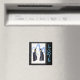 Das Design auf diesem Magnet ist zwei Kaiserpinguine, die illustriert mit Wasserfarbenstiften gegenüberstehen. Im Hintergrund sind kleine, gelbe Liebe Herzen gemalt hinter zwei großen blauen Liebe Herzen zentriert hinter den Pinguinen. Gerahmt in einer dünnen, weißen Grenzlinie innerhalb eines dicken schwarzen Randes. Das Wort LIEBE ist neben dem Bild.