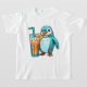 Diese skurrile Illustration zeigt einen fröhlichen Pinguincharakter, der einen orangefarbenen Schüttelfrost mit einem lebendigen orangefarbenen Strohhalm und einem verspielten Zitruspflücken fröhlich umschlängelt.