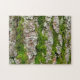 Lebendige grüne Moos wachsen in vertikalen Rillen aus verblasster Kiefernbrücke. Das Naturfoto zeigt die abwechselnden Streifen von Rinde und Moos sowie die Textur jedes einzelnen. Die Rinde ist überlegt, schuppig und mit feinen Farbtönen versehen: Grau, Braun und sogar hellgrün. Der Moos besteht aus unzähligen kurzen feinen Haaren, als ob der Baum einige grüne Pelzmarken gewollt hätte.