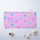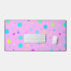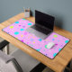 This large desk mat showcases a neon Memphis geometric pattern with colorful retro 80s shapes on a vibrant pink background. It adds a stylish pop of color to your workspace while protecting your desk surface. Perfect for creative setups and gamers.
