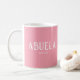 Abuela Kaffee Tasse Design mit einem Jahr etabliert mit einem weißen Stempel Schriftart Set auf einem rosa Hintergrund. Klicken Sie auf anpassen, um die Hintergrundfarbe zu bearbeiten!. Besuchen Sie unseren Shop, um diese Tasse in einer großen Auswahl von Großvaternamen zu sehen.