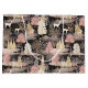 A gorgeous pink and black abstract featuring elegant white deer prancing in a snowy landscape dotted with pink and cream pine trees against a night black background.