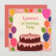 Feiern Sie Ihren großen Tag mit dieser rosa Party Einladung zum 1. Geburtstag! Mit farbenfrohen Ballons, einer Schokoladenkuchen-Illustration und Platz für alle Party-Details, ist diese Karte perfekt für eine süße und unvergessliche Feier. Dieses charmante Design eignet sich ideal zum ersten Geburtstag von kleinen Mädchen und macht die Einladung von Freunden und Familie einfach und unterhaltsam.