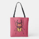 Farbenfrohe Käfertasche mit einer künstlerischen Vektorgrafik, die einen Hirschkäfer mit großen, mit Zierelementen gemusterten, in lustigen Gelb- und Orangenfarben über süß-rosa Hintergrund darstellt. Sein Entomologiedesign wird jemanden ansprechen, der Käfer, Insekten und wild lebende Tiere Liebe.