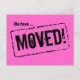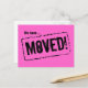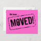 Pink bewegte Postkarten für Ihre neue Zuhause-Adresse. Neue Hauspostkarten mit Aufmerksamkeit, die Farben bekommt. Helles rosa und schwarzes Design mit Briefmarke aus Gummi. Benutzerdefinierter bewegter Text; Wir sind umgezogen! Fügen Sie Ihre neue Adresse auf der Rückseite ein. Moderne Karten für Zuhause und Business.