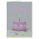 Ein rosa Cartoon-Geburtstagstorte mit sprinkle-überzogenem Zuckerguss, der die Seiten hinunter läuft, und eine beleuchtete Kerze sitzt auf einer goldenen Platte auf einem Tresen, der mit bunten Punkten bedeckt ist.