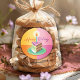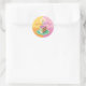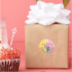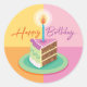 Eine bunte Scheibe Geburtstagskuchen mit rosa und grün dekorativem, rundem Aufkleber, um die Touchs auf alle Ihre Geburtstagswünsche zu setzen.