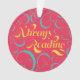 Zeigen Sie Ihre Buchseite und dekorieren Sie Ihren Weihnachtsbaum mit diesem lebhaften, verblüffenden Ornament in kräftigen Rosa-, Gelb- und Blautönen mit dem Wort "Always Reading" und einigen dekorativen Schnörkeln. *Bitte beachten Sie, dass das Zazzle-Wasserzeichen, das in der Zoomvorschau angezeigt wird, nicht auf dem gedruckten Endprodukt angezeigt wird. © Bookish and Wonderful