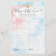 Diese Babydusche-Spielkarte verfügt über einen modernen Schriftart-Drehbuch auf rosa blauem Aquarellhintergrund, der sich perfekt für Gender-Enthüllungen-Party eignet.