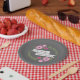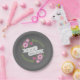 Babyduschen-Papier-Teller, der eine Illustration eines rosa Blumenwreath mit Fahne über einem grauen Hintergrund kennzeichnet. Text sagt, dass "es ist ein Baby"