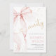 Pink Bow 90th birthday invitation. Modern feminine design in blush pink and gold. Features trendy watercolor coquette bow, and heart script font "ninety". Perfect for an elegant style women's bday celebration. Personalize with your own details. Printed Zazzle invitations or instant download digital printable template.