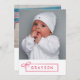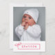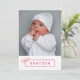 Geburtsankündigung eines kleinen Mädchens mit einem großen Foto und dem Namen Ihrer Tochter in einem skizzierten Rahmen mit einem Bogen in Rosa.