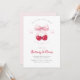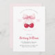 Feiern Sie die süßeste Babydusche mit dieser Pink Bow Cherry Baby Shower Einladung. Mit glänzenden Aquarellkirschen und einem zarten rosa Bogen strahlt dieses Coquette-Design Charme und Weiblichkeit aus. Die weiche rosa und rote Farbpalette und das elegante Drehbuch machen es zu einem idealen Ort für eine stilvolle und fröhliche Babydusche für ein kleines Mädchen.