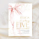 Pink bow girl's 5th birthday invitation. Modern feminine design in blush pink and gold. Features trendy watercolor coquette bow, calligraphy heart script font and modern typography FIVE. Perfect for an elegant style girl's fifth bday celebration. Personalize with your own details. Printed Zazzle invitations or instant download digital printable template.