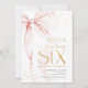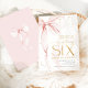 Pink bow girl's 6th birthday invitation. Modern feminine design in blush pink and gold. Features trendy watercolor coquette bow, calligraphy heart script font and modern typography SIX. Perfect for an elegant style girl's sixth bday celebration. Personalize with your own details. Printed Zazzle invitations or instant download digital printable template.