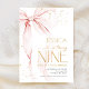 Pink bow girl's 9th birthday invitation. Modern feminine design in blush pink and gold. Features trendy watercolor coquette bow, calligraphy heart script font and modern typography NINE. Perfect for an elegant style girl's fifth bday celebration. Personalize with your own details. Printed Zazzle invitations or instant download digital printable template.