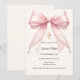 A soft ivory background, decorated with a pink large bow with pearls and a golden cross. Personalize and add a name and details details.