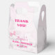 Design features a light pink background to the image of a pink bow amid white puffy clouds. Name of guest-of-honor is displayed on front in an elegant pink font above the event and date, which are featured in bold pink. Message of gratitude is featured above. Design features room for both shower date and due date. All text is customizable.