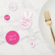 Pink and white confetti pieces are personalized! The large confetti piece features a pale pink background on one side, a bright pink background on the other. Your message/baby's name is displayed on either side. Medium-sized confetti feature a pale pink background to the image of fluffy, white clouds on one side, a white background to bright pink text on the other. Finally, the small confetti feature a bright pink background to the image of a pink bow on one side, a white background to the initial you supply displayed in a bright pink font on the other.