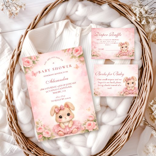 A sweet and charming baby shower design featuring an adorable bunny surrounded by soft pink roses and delicate butterflies. The gentle watercolor background in blush tones creates a romantic nursery aesthetic, while the floral details add a dreamy storybook feel. A tiny bow and tutu give the bunny an extra adorable touch, making the design perfect for a soft and feminine celebration. Ideal for a pink themed baby shower with a whimsical floral atmosphere.