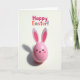 This card shows a simple still-life scene with a single bunny-like egg character centered near the bottom, set against a bright white background 🐰. The main figure is a soft pink egg shape with long upright ears, each ear showing a darker rose inner area. Its face is minimal with small dark oval eyes, a tiny inverted V nose, and two round rosy cheek spots that give it a sweet, friendly look, like it’s quietly leaning in to greet someone. Above the character, a seasonal greeting is placed in the open space, with words arranged in mixed colors including hot pink, coral, and deep gray. The lettering sits high and roomy, leaving plenty of white space between the text and the character for an airy feel 🌷. Light falls from the right, creating a gentle but noticeable shadow stretching to the left, which makes the figure feel grounded and close. The surface looks smooth and matte, and the pink bunny-egg stands out crisply against the white field with its left-cast shadow.