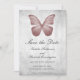 Elegante und einfache Hochzeit speichern Sie das Datum einladen mit einem rosa Schmetterling vor einem grauen grunen Hintergrund. Dieses Design ist eine einzigartige Wahl für die Ankündigung einer modernen Hochzeit. Einfach an Ihre Hochzeitsdetails anpassen. Klicken Sie auf "Anpassen", um weitere Personalisierungsoptionen zu erhalten.