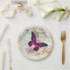 Die Teller aus Papier mit einem eleganten, rosa Magentafelschmetterling mit lila Akzenten verbergen sich auf einem schimmernden Vintagen Muster mit knebelrosa Rosen und anderen weichen Dekorelementen. Ein charmantes skurriles Design.
