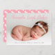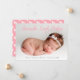 Niedliche und minimalistische Babyankündigung mit einem Foto Ihres Babys. Fügen Sie den Namen Ihres Kindes in einem rosa Kalligrafieschrift hinzu. Die Rückseite ist in Rosa und Weiß gehalten.