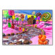 Das ist mein Candyland-Design-ein Lebkuchenhaus in einer rosa Bonbonlandschaft mit bunten Lollipops, gummy Bären, Zuckerrohr, Pralinen und Baumwollbonbons an einer Schokoladenstraße.