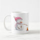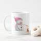 Niedliche Tasse mit einer Illustration eines Schneemanns mit einem rosa Hut und schal gerösteten Marshmallows. Gutes Geschenk für die kommenden Ferien. Personalisieren Sie den Text mit Ihrer eigenen Nachricht. Illustriert und entworfen von Patricia Alvarez.